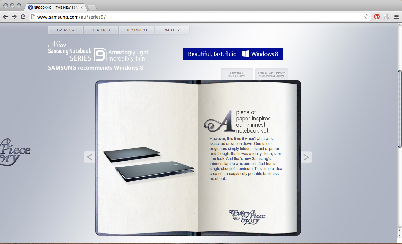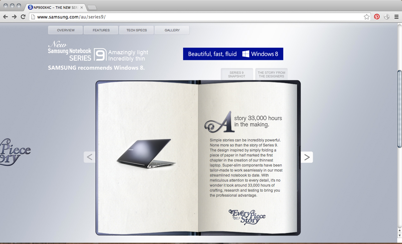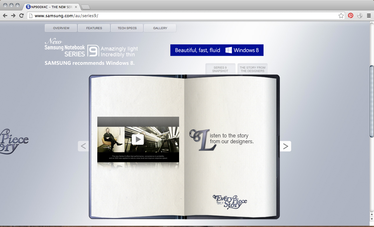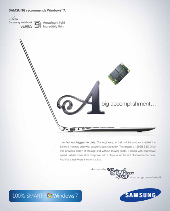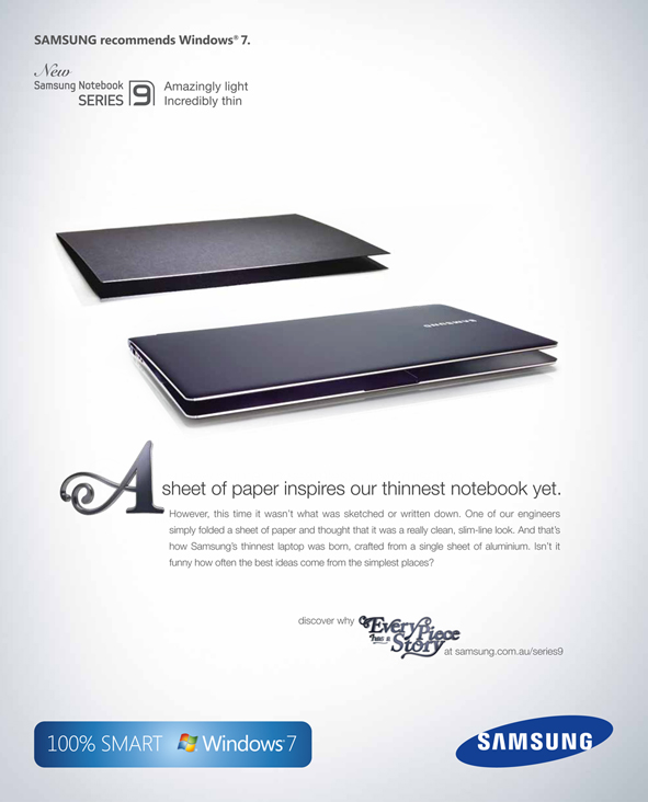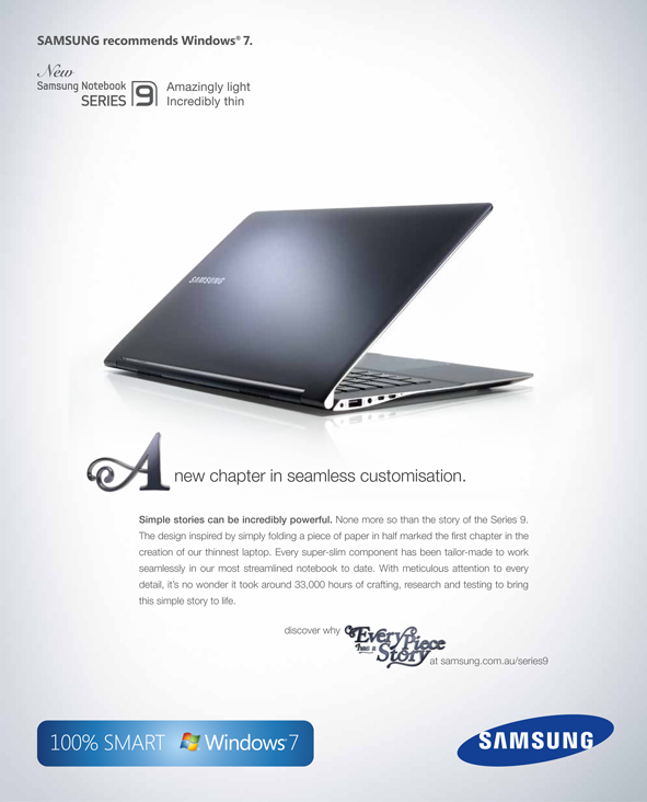 To showcase the expertise and craftsmanship that goes into a Samsung laptop, the launch of the Samsung Notebook Series 9 focussed on every equisite detail of the product. Each piece had it’s reason for being, its story told to reveal a direct benefit to the consumer. With coverage over digital, print, outdoor and special build, this campaign launched the Samsung Notebook Series 9 into Australia.