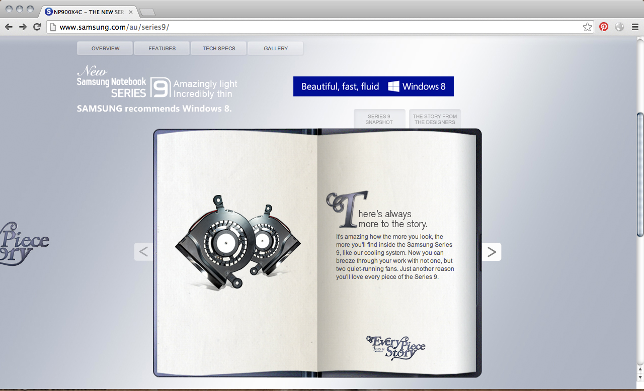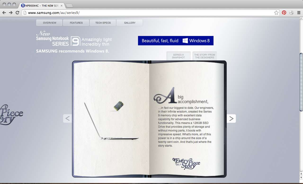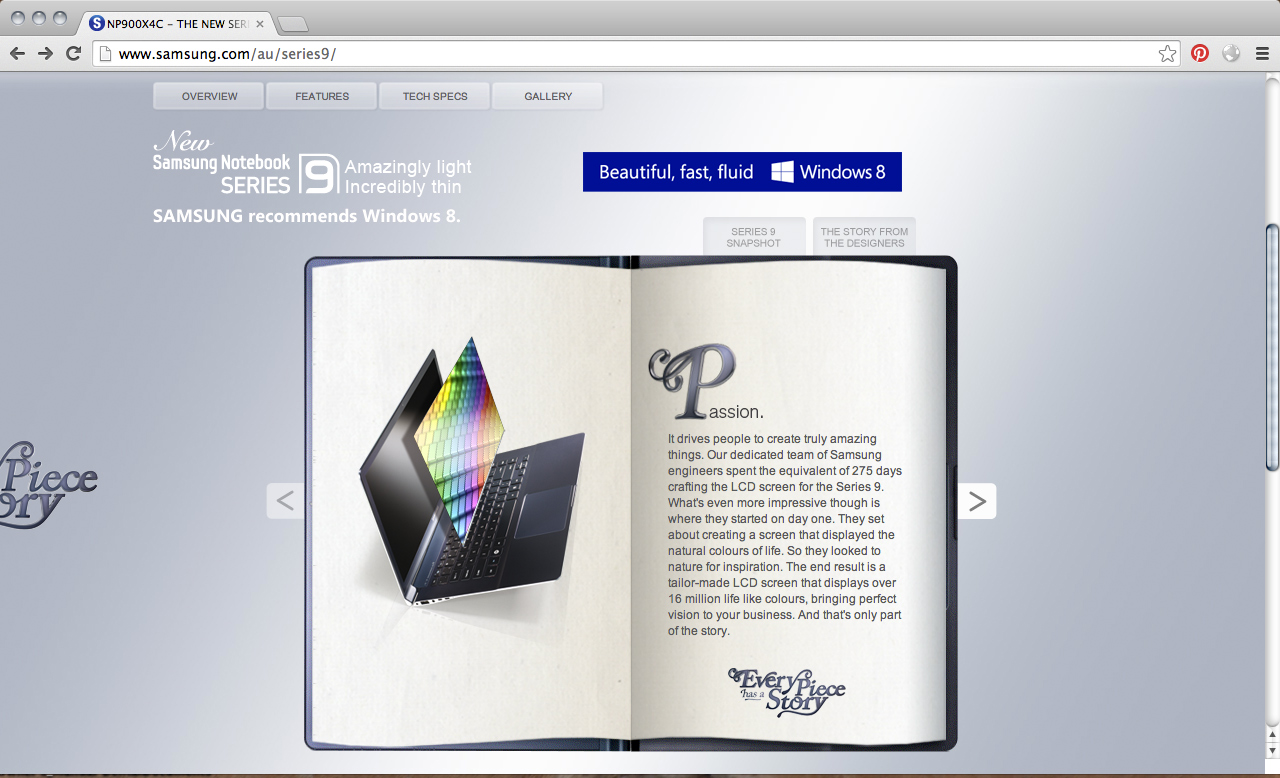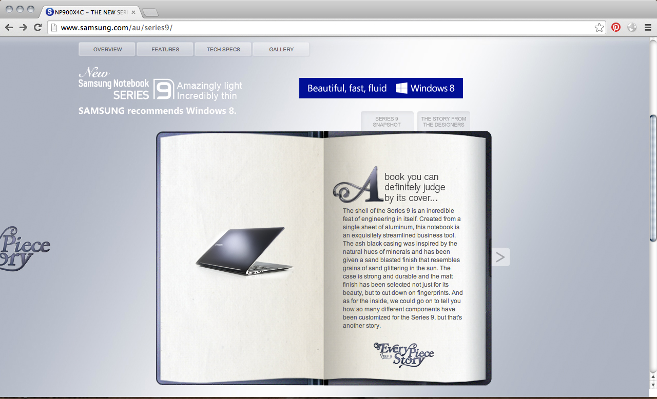 To showcase the expertise and craftsmanship that goes into a Samsung laptop, the launch of the Samsung Notebook Series 9 focussed on every equisite detail of the product. Each piece had it’s reason for being, its story told to reveal a direct benefit to the consumer. With coverage over digital, print, outdoor and special build, this campaign launched the Samsung Notebook Series 9 into Australia.